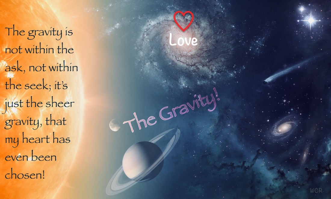 Can anyone see, can anyone see that my heart is floating; floating within the gravity of Your love? The force of Your love is so attractive to my heart, Your love just won’t let go of my heartstrings. It seems like forever, as far back as I can remember; my heart is being pulled, into the center of Your love. As a child, I was taught the concept of relativity, but that concept seems to be utterly irrelevant. My heart is utterly amazed, the very laws that governs my universe; does not seem to apply to Your love!