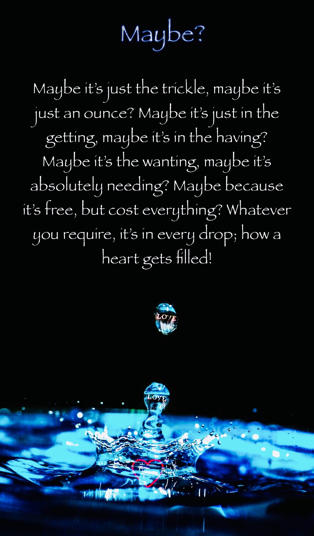 Maybe I’m just totally amazed, that I would even be sharing this. My heart, my soul; and a love held so dear. This from a heart, within a lonely, silent river. Very much skilled in the art, of being absolutely seen; but rarely heard. But it’s Your love, that has profoundly changed my being; heard, the love that moves my heart. Maybe I’m amazed, but not You; it’s all part of the master plan. Maybe I’m amazed, at the way I have come to love You. I know now, You’ve loved me all the time. Maybe it’s just me truly amazed, that Your love has never changed; even after all these years!
