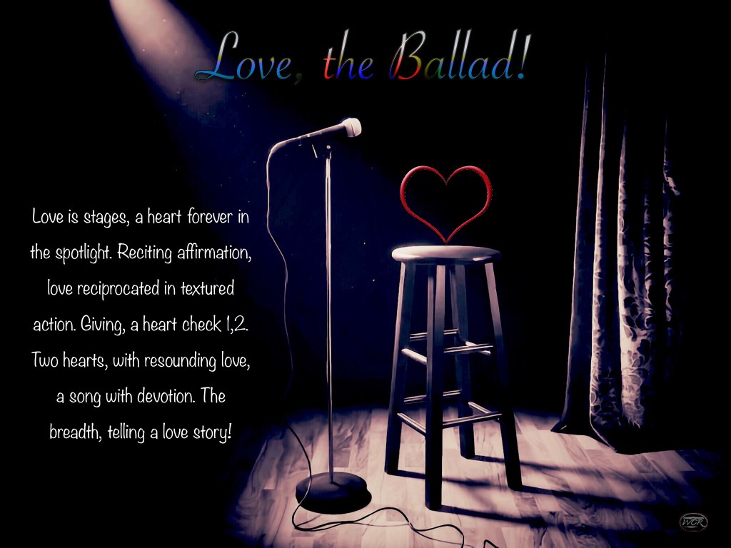 Here, and Now. I give my heart, give you my everything; my Endless Love. All My Life, my soul prayed; for a love like yours. To have, to hold; you, will always be my heart. The love song, in a symphony. Every heartbeat, playing a sweet rhythmic melody; A love so beautiful. Every breath, breathed out in harmonic unison. A heart knowing, how to sing a love ballad; The Greatest Love of All. “B” sharp, noted never letting it be about falling. But being, in love, Always, and Forever. The love being, a Total Eclipse of the Heart. Love is Forever, even though some days; the heart wants to groove, to a brand new funk. A little ditty, will help to tell the tale. A heart with a verse, writing another love song. Open Arms, needs an open heart. For a love ballad, to resonate with a poetic hue. My heart is moved, by a love soul proven. Love, You Are the Reason; for the breadth within my lungs. You’re the Inspiration, to profoundly wanting to be, a heart changed. Do What You do, leave me breathless. Love, tell it to my heart. How, am I Supposed to Live without You? My, every breath you take. The beauty to feel, the love to hold; the presence, by my side. Nothing, can Change this Love. Every lyric, will be original. A heart, being forever swayed; feeling how steady the beat. A traditional ballad, will never be this heart and soul, singing a typical love song. When, I’ve come to the end of myself. It won’t be, Hello; love, is it me you’re looking for? Not the Kiss, and Say Goodbye. On the Wings of Love, how every breath finds forever. Love, there you can find my soul. Caught up in the Rapture, of You!