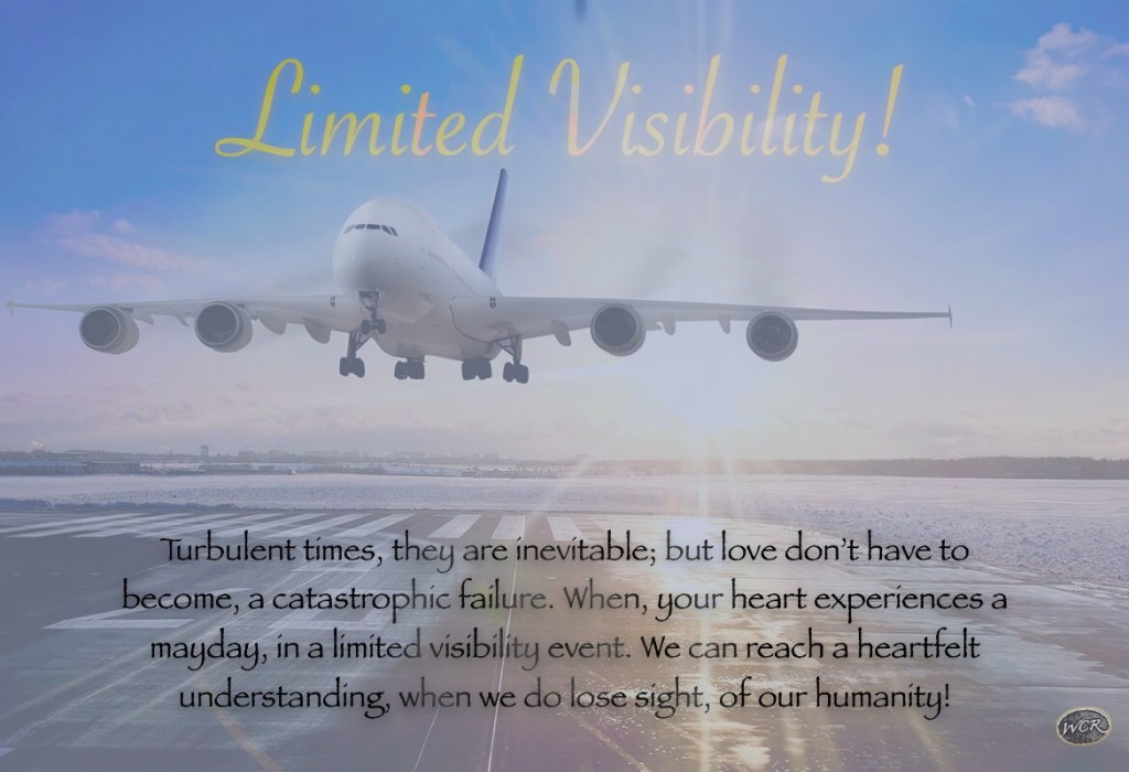 Mayday, wcr281; declaring a state of emergency. There’s a gaping void, within the center of hearts of today. A hole in hearts, creating an untenable situation. Genuine love, seeping out the hearts of mankind. Limited visibility, making it hard for hearts to see, we’re in this together, humanity. The love that fuels the heart, we’re losing it, there’s a tear in the fabric; this is a mayday. Love, is the tower, strength in the midst of uncertainty. To advise, give hope, encourage the heart, to face fear of the unknown. Why, do we think we can put love on autopilot, and think we can see when there’s a need, for love to act? Real love, will always require our full attention. To avoid, limited visibility becoming, a catastrophic dilemma. A heart loosing altitude, with a sinking feeling, in the pit of your stomach. Regaining faith, when love is truly felt, through an act of compassion. Even, from a thirty thousand foot view, love sees a new horizon. But only if, love is more than just, a blip on the heart’s radar, hearts. So limited visibility, won’t become an extremely clouded perspective. Love, is like an ocean, that won’t let a heart, crash and burn. Stick and rudder, makes love become the instrument, to level off the heart, and keep the love on course. Hearts, letting go of the negativity, will find common ground. Love is a runway, a safe place, where hearts can come together, and take flight. Testing, testing; hearts, are you listening? When the AIR between, becoming overwhelming? Love is the oxygen, helping your heart breathe. When the TRAFFIC, the noises of life are conflicting, with heart and mind. Don’t let your heart, lose CONTROL, of your humanity. Love, what’s stops a limited visibility from becoming, a rapid rate of descent. You don’t have to see the heart, for there to be love, in the atmosphere!