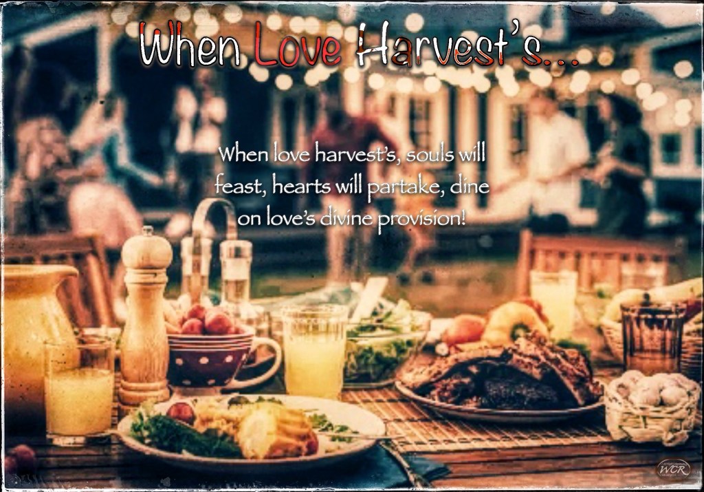 When love harvest’s, hearts are gathered. What love yields, the heart positions the soul, to be enriched with love’s abundance. For love, to be adequately prepared its harvest, it first sows generously, so the heart and soul can indulge, in its bountiful goodness. Love produces the evidence, the heart’s display become evident. When love harvest’s, it’s a feast for the soul, a fulfilling moment for the heart; love’s divine provision. Fruits of love’s labor, will never go unnoticed. Deep love captivates, profoundly cultivates, a quantifiable blessing of beauty. Love in quantity, doesn’t make it substantial; quality, what makes it truly quintessential. Substantive love, not what eyes glean, but what the heart receives, becoming what the soul needs. Love, with its beautiful presentation, never leaves the heart desiring, lets the soul partake of love’s deep seeded bounty; what love wholeheartedly harvest’s… Satisfies!