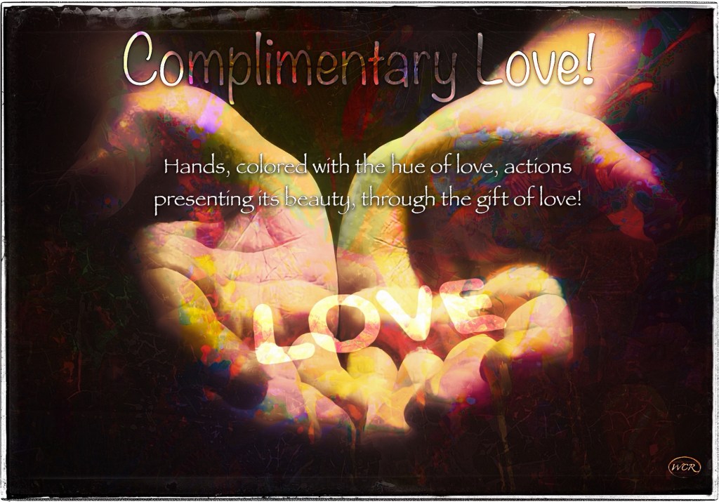 It gets me every time, my heart not being able to resist, the urge to give of myself, share interrelated love. I keep lots, within the depth of my soul. Prepared for the inevitable moment, someone comes to ask of me. Hello, friend, can you spare my heart a little love? I don’t need much, just enough to feed my soul. Indeed, my heart waits earnestly, for the opportunity to give some away; complementary love. No one has to ask twice, or beg on bended knees. My humanity says, you had me at hello. With every little change, with every encounter, the change in me is profound. The little love I give, with every seed I sow; it’s an investment, mutually compounded. Your heart, will intuitively compliment my love, enhance the quality therein. In every season, love the reason, harmonious nature is strengthened. Breathing in the same care, the ambiance releasing its significance, love’s reign. Reciprocal love, won’t cast doubts, will never castigate another heart, with unsupportive meaning. Love, draped within the colors of its true essence, compliments heart, and soul. Complimentary love, doesn’t need to be wrapped up in a pretty bow, just gifted intentionally. It’s not embraced with words, when actions presented itself. In its benevolence, it’s the endearing gift, never meant to be kept, but regifted over and over. Love, the gift of its meaning, shimmers endless, within the breadth of its divine brilliance!