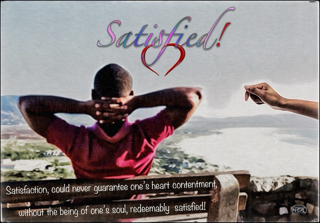 I am satisfied, my heart’s breadth, irrevocably fulfilled. Love’s desire spills, meaningless hunger has lost its thrill; could never again satisfy, become my soul’s unadulterated fill. Thoughts, don’t awaken the dawn, pondering my soul’s yawn; my heart knows love’s wonder, nature of my dearest fawn. My soul’s satisfaction, doesn’t plead for justification, but moved by heartfelt revelation. I’m contented to be, what my soul is pleased being; truly satisfied. I am filled, my heart sustained knowing, my soul’s beyond the place of still becoming. I’m convinced, my heart conceded; my most profound zeal, embracing. Not grappling with what persuasion yields, but what boundless confidence wields; transformation. Of love, I am persuaded; heart and soul never debated; to be or not to be, deeply elated. My soul, every day again doesn’t make certain; what’s resides at the hem of my heart’s curtain. Unapologetically, love leaves my heart exposed, my soul free of its veil. I am content; to assure, reassure, my love’s unconditional assurance. I am satisfied, within my heart, money doesn’t move. The chase of it, my soul has reproved, tethered strings love has removed. Of my inherent worth, its worthless plea could never suffice. Love’s fulfilling price, its satisfaction for me, thrice. Oh, I am satisfied, my heart’s purest breadth, irrevocably fulfilled. Love’s desire spills, meaningless hunger lost its thrill, never again satisfy; be of my heart’s deepest fill. In perpetuity, my soul satisfied in being, breathlessly contented, still!