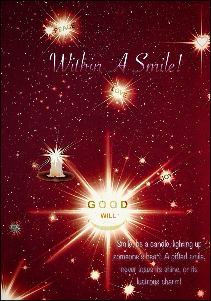 Within the dawn of every smile, light enlightens the mood. When the heart’s smile beams, lost souls sail to find hope in distant horizons. On the wings of a smile, encouraged souls soar, the heart lifted to new heights. A smile has a captivating melody, a song in the night, like a breath of fresh air. Resting gently on the heart, like the morning dew. Like a breathtaking hue, a warm smile will melt the heart, emboldening the soul to exhale. Like a flower opening, like a window open to let in the moment, like a phoenix rising; hearts open to the possibilities, a welcoming smile provides. A smile like a candle, will surely light up someone’s heart. One that never loses its shine, its lustrous charm. Wrapped up within a smile; joy, love, warmth, peace, goodwill, heart and soul. Freeing, freed smile lets the soul breathe. Give it, give it the freedom to be, an endearing act. Open up your heart, let the sunshine from within, your soul displaying a face with a grin. With every smile, let love be the reason; in every season, Christmas came early. A heart presenting itself, within a gifted smile!