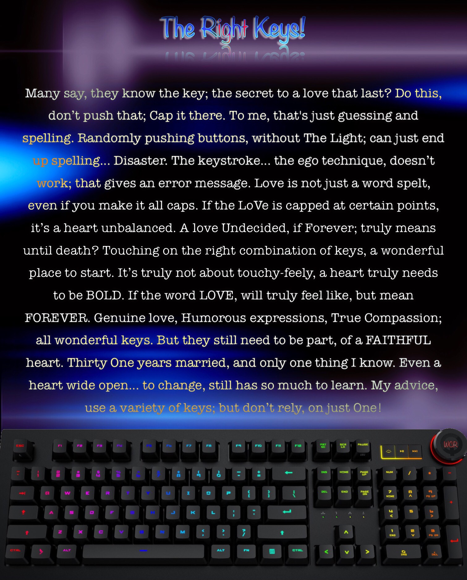 What? From about the time my wife and I, reached our twenty fifth anniversary. People have asked me this question; what is “The Secret,” to a lasting marriage? Even this week, I was asked this question. A few years ago, I decided to write; what I believe to be a simplistic thought. Whenever I get asked the question, my answer is always the same; “LOVE THE ONE YOU’RE WITH!” That’s my take, love will never be perfect; there’s no right method, no secrets. To me, it’s not about finding the right person; “but you become the right Love, for them.” There’s no secret love, just simply love the one you’re with. Too many people, rely on their feelings to guide them; when it’s the heart, that truly knows best!