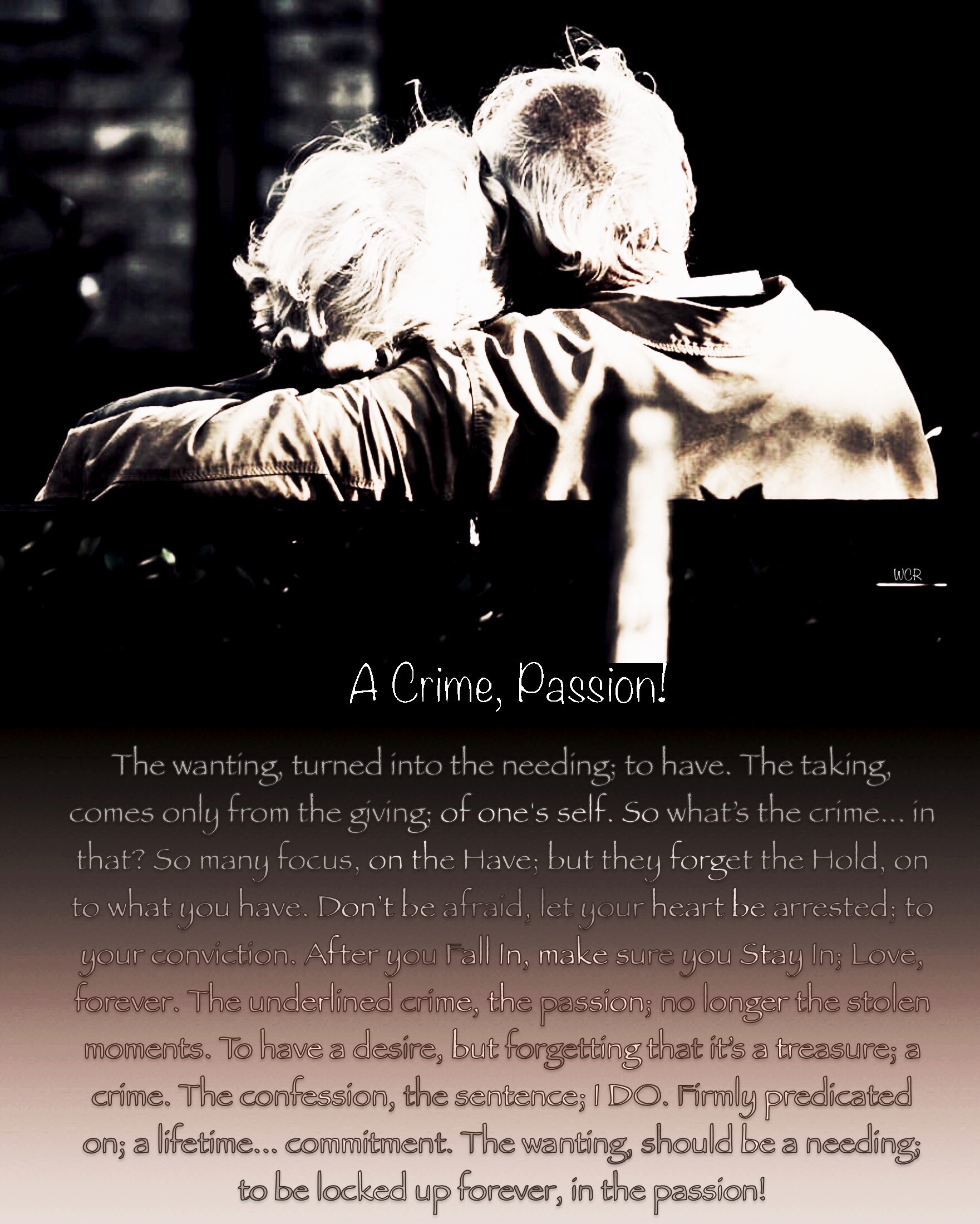 Let me tell you the story, how it drove a heart to passionately want. Set out to unapologetically steal, what wasn’t mine. I was young, some called me crazy; said I was making a huge mistake. A decision, that was going to ruin my life. Call me naive if you will, I wasn’t looking at the writing; they struck upon the wall, just the love written… on the desire. The co-conspirators; heart, and soul. It was a want, but also something I needed to do. If I truly believed what a voice, whispered into my soul. The passion drove thee, but all they could see, just a crime. It was thirty two years ago, when my heart committed; but it’s the act itself, that will forever be remembered. The crime they saw, but the passion I felt. My heart was heavily invested, I guess you can say; “the heart wants, what the heart wants.” Powerless to stop, wasn’t the conviction. Call it what you truly will, but I forever vowed; to stand by my heart’s conviction!