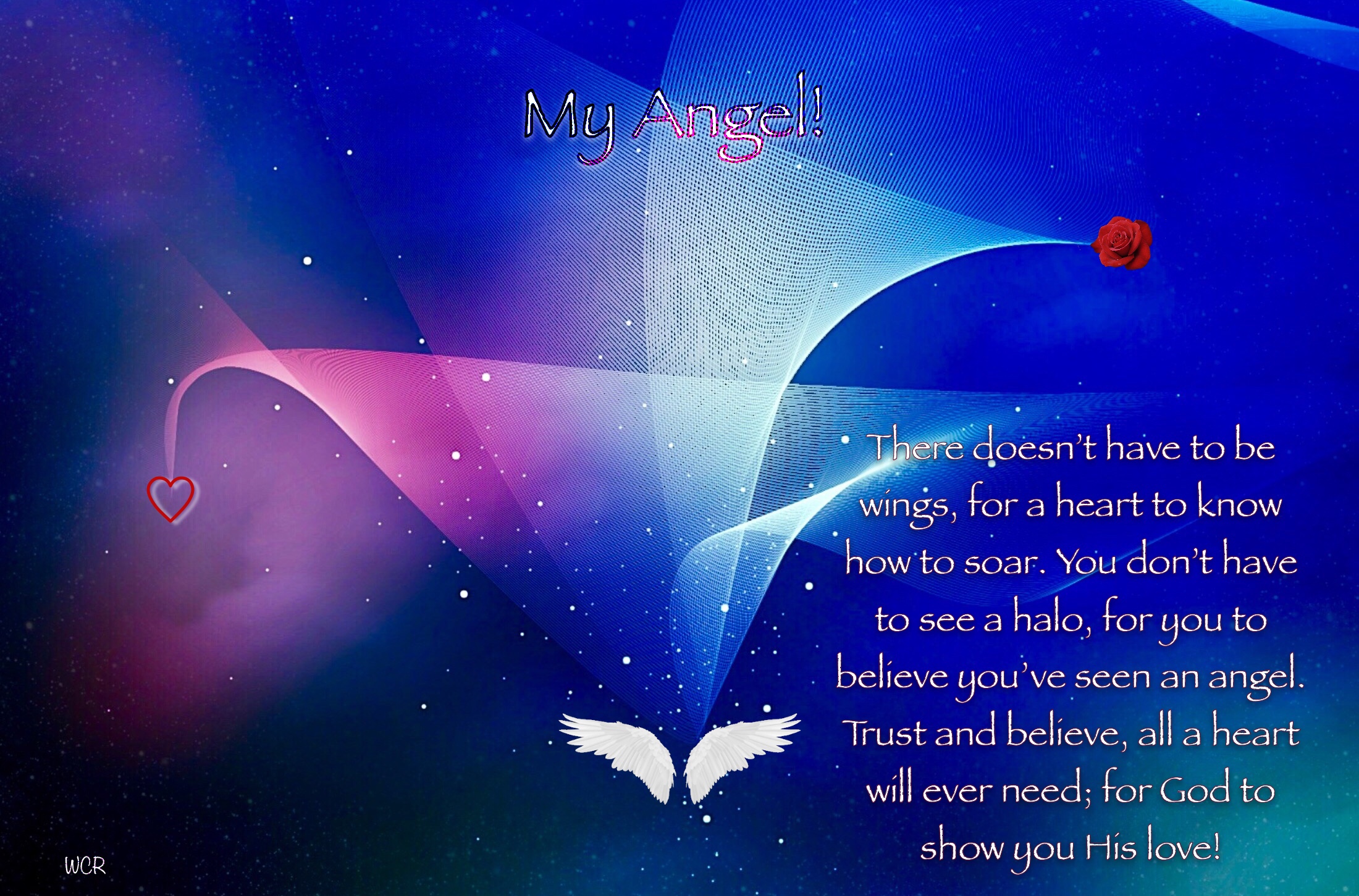 I believe in love, I believe our love is forever. My love, in you I believe. I believe God hears prayers, I believe God listens to the heart. I know God heard my heart, because my answered prayer… was you. I love that you care, I love that every day you dare. To stand strong on your own two, hope and faith. I love you from days of old, I will love you in a thousand years. When we both get old, with a slight touch of grey. When all in my heart is told. I LOVE YOU, will never be too bold; to tell about a heart of gold. Your love has much meaning, knowing your heart has meant so much. What I mean through all of this, I love who you are… to me. I know a heart can beat, without having breath. I know a soul can breathe forever, but only when that heart truly knows; what love gives every breath? The greatest gift is love, a committed love is the forever gift… to a grateful heart. I believe God has given your soul wings. You may not notice my eyes looking, but my heart always knows; when your heart starts to soar. You may doubt it, but my heart has always believed it; you are… My Angel!